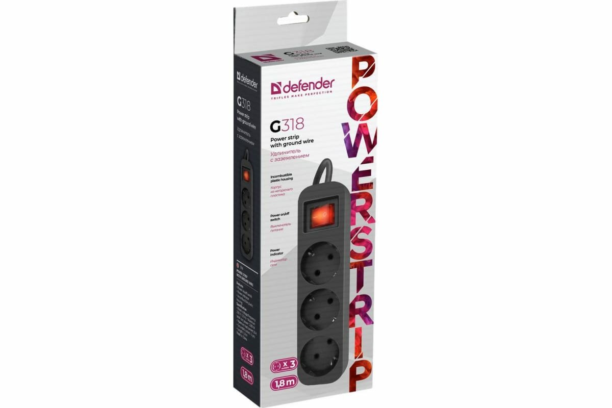 Сетевой удлинитель с выключателем Defender G318, 3 розетки, 1.8 м, с/з, 10А, 2200 Вт, черный