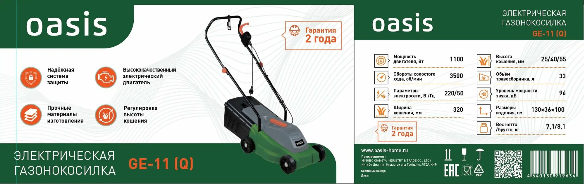 Газонокосилка электрическая Oasis GE11 1100 Вт 32 см интересное: