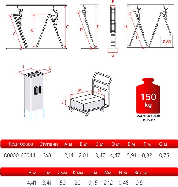 Новая высота Лестница-трансформер 3-х секционная 3×7 ступеней, 3×1,9 м, высота 4,5 м, нагрузка 150 кг, алюминий, новая высота