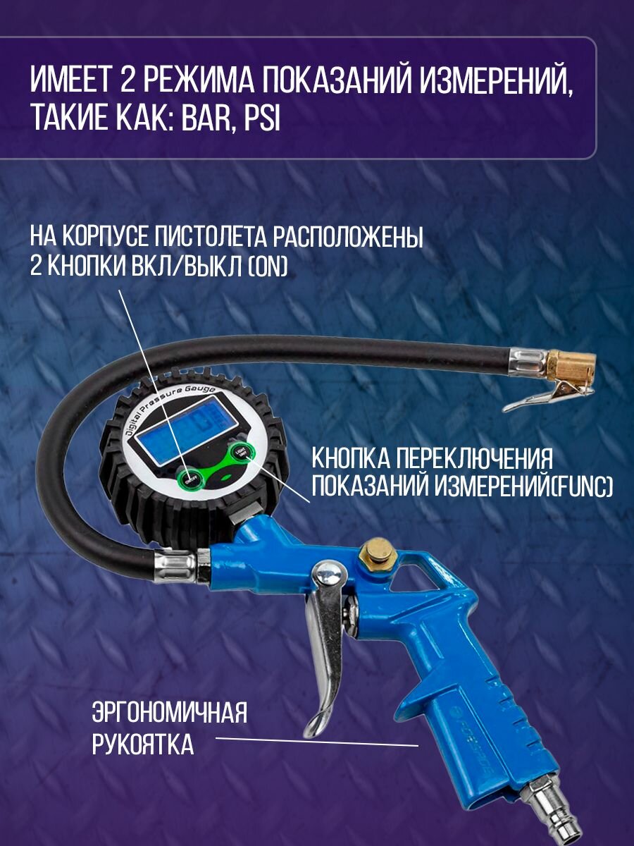 Пистолет для подкачки колес с цифровым манометром и шлангом, в блистере