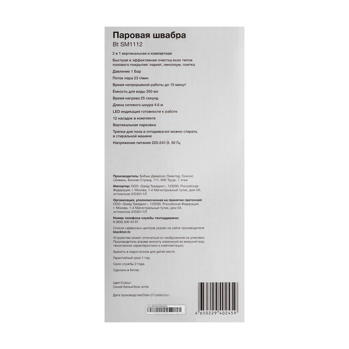 Паровая швабра Blackton Bt SM1112 синий/белый интересное: