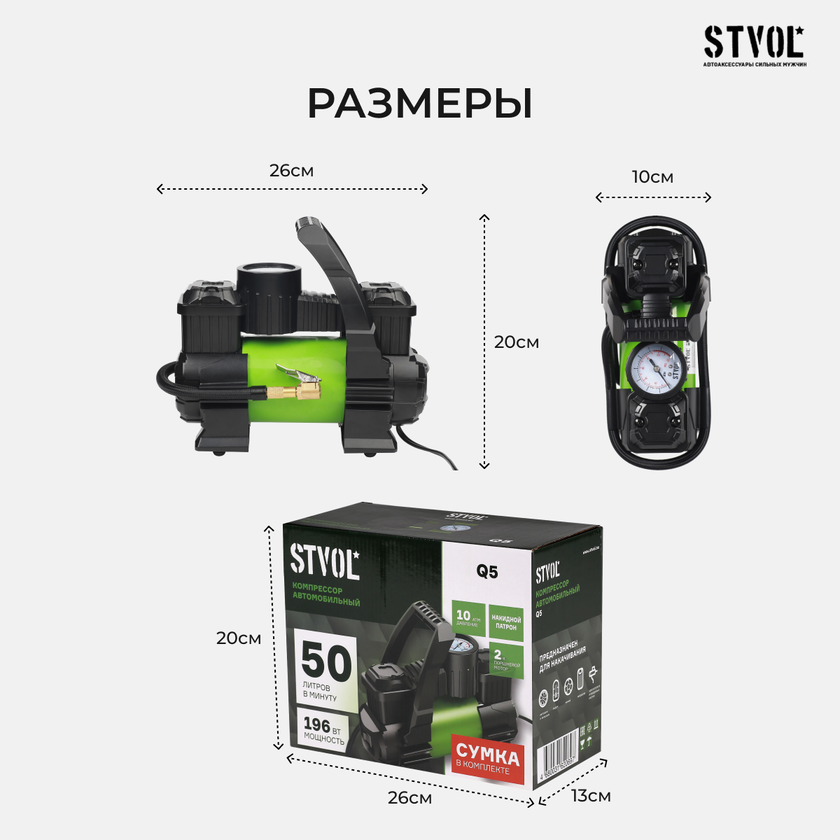 Компрессор автомобильный двухпоршневой STVOL Q5, металлический, 50 л/мин, 12В, 10А, с сумкой