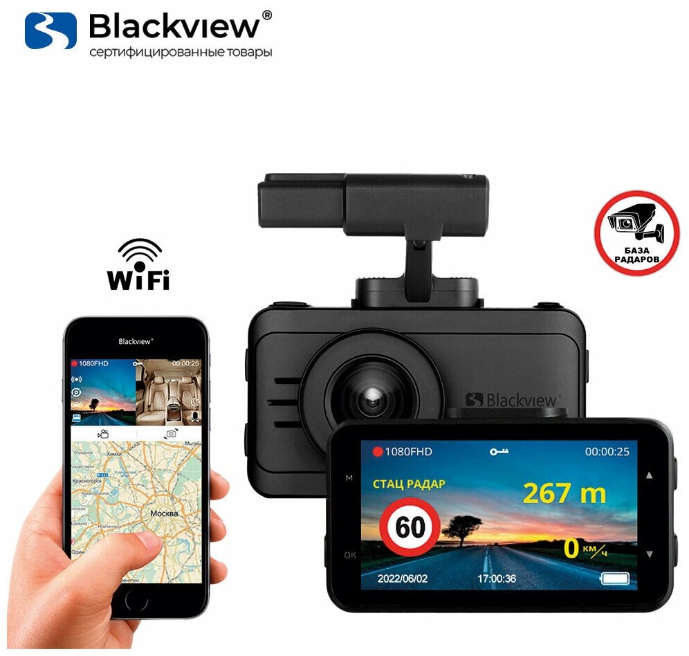 Комбо-устройство / Видеорегистратор с оповещениями о камерах Blackview V GPS/ГЛОНАСС, 1296p с функцией GPS радара, WiFi, сенсор SONY