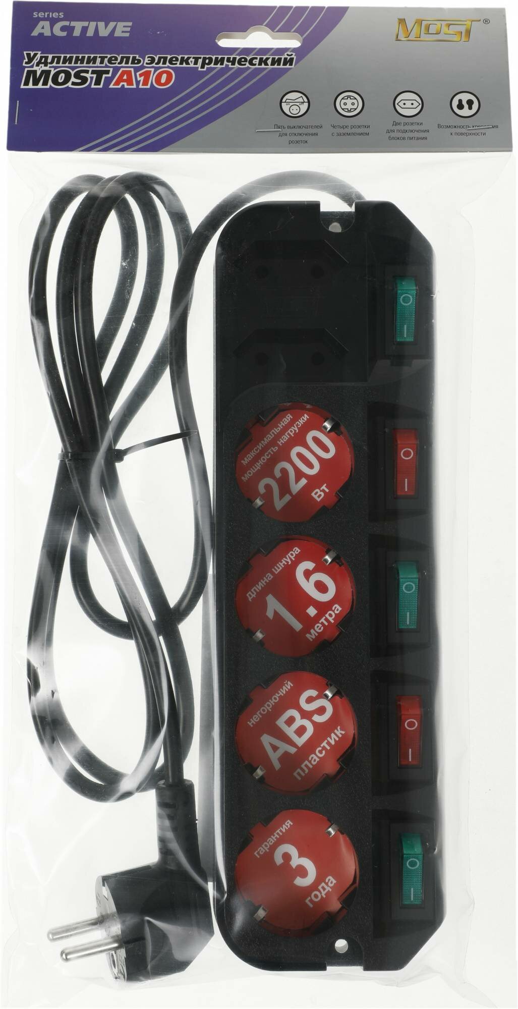 Удлинитель MOST Active A10, 6 розеток, с/з, 10А / 2200 Вт черный 1.6 м