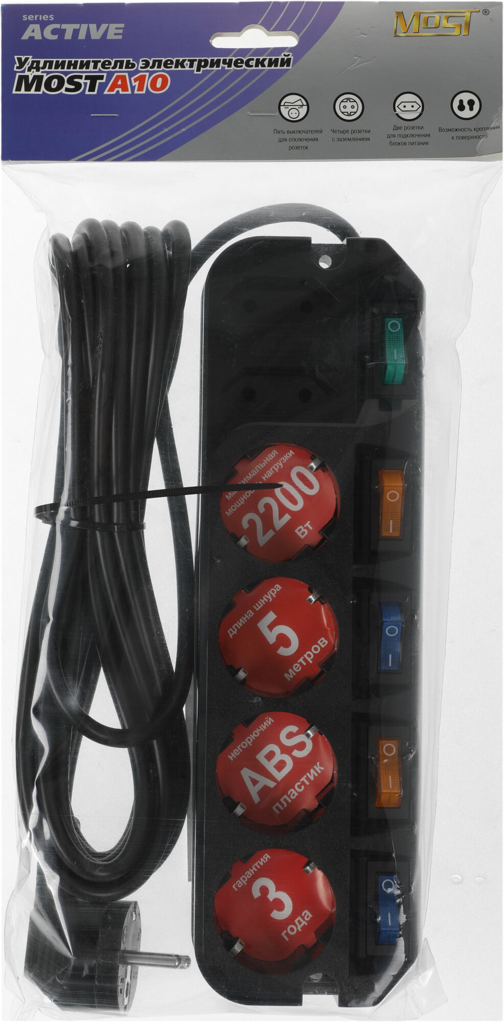 Удлинитель MOST Active A10, 6 розеток, с/з, 10А / 2200 Вт черный 5 м