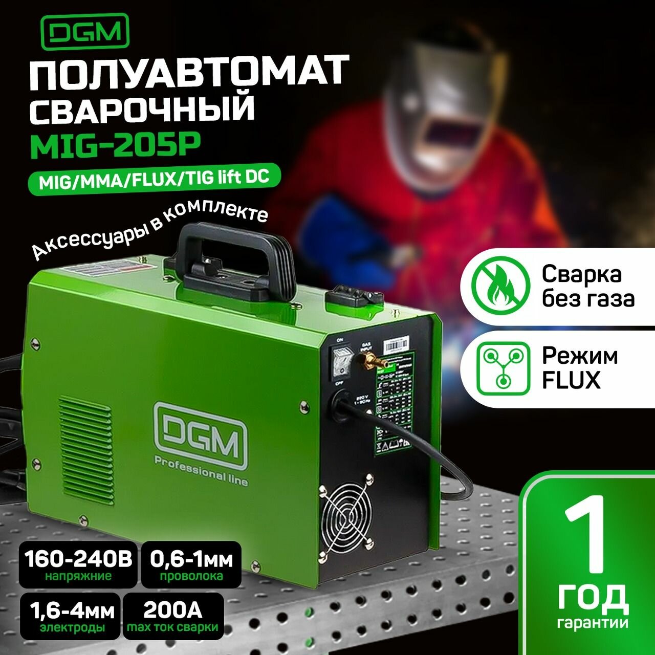 Полуавтомат сварочный DGM MIG-205P (220В, MIG/FLUX/MMA/TIG, встроенная горелка 2 м, смена полярности)
