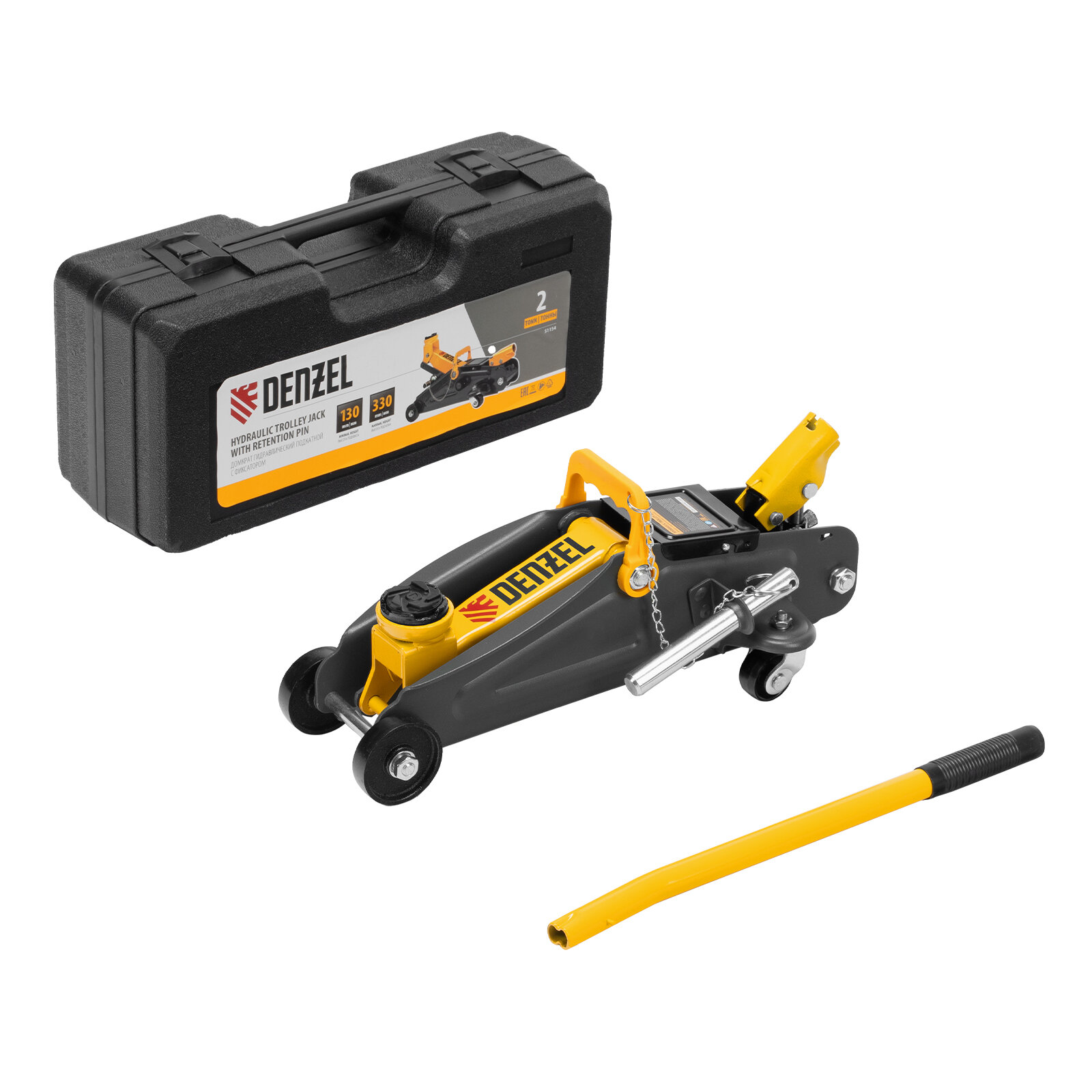 Купить Домкрат гидравлический подкатной с фиксатором Denzel 2 т, 130-330 мм, в кейсе 51154