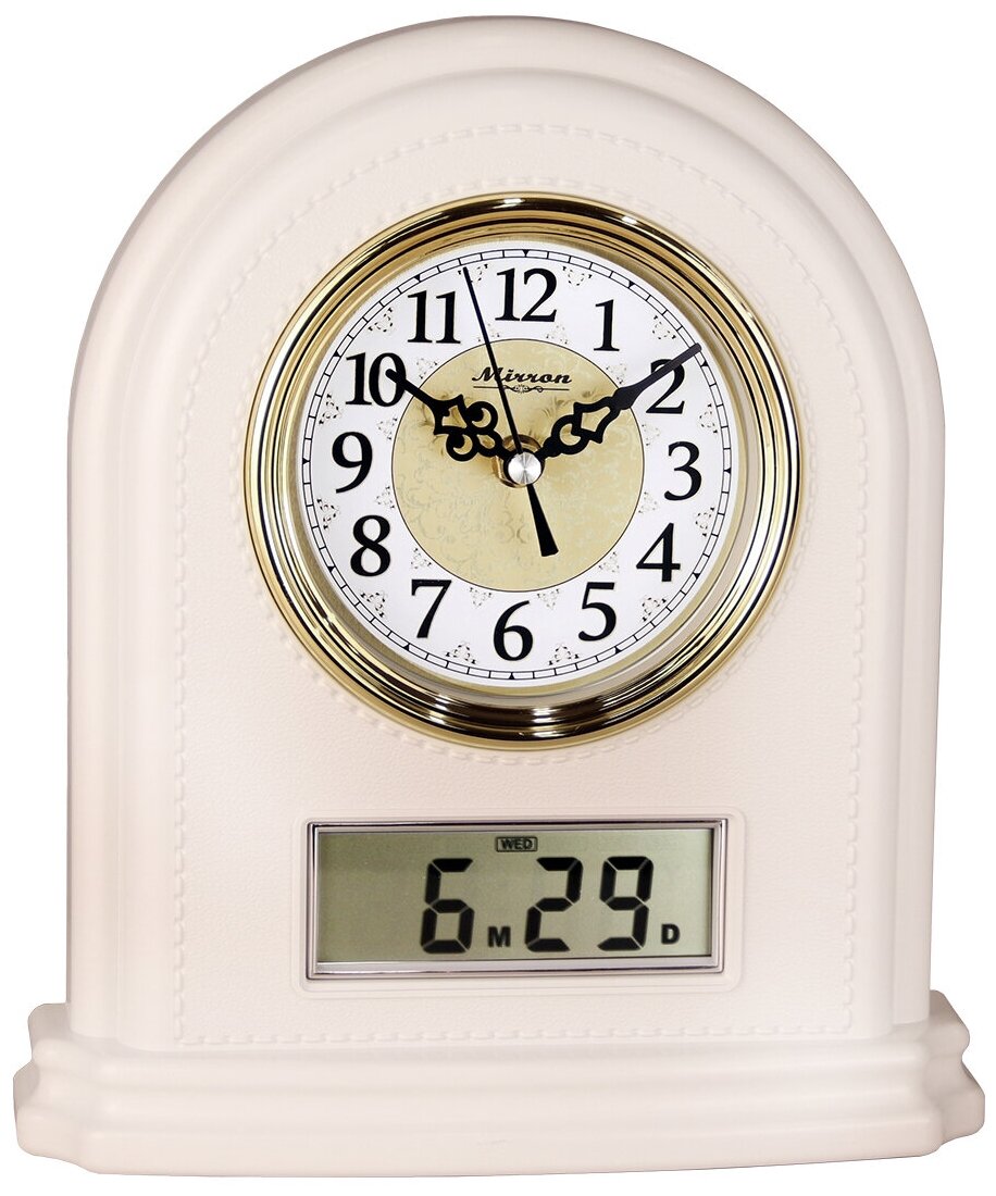 Классические настольные часы с ЖК дисплеем SN06C ЖК БП/Белый (перламутровый) цвет корпуса/Золотой ободок циферблата/Светлый циферблат/Арабские цифры/Часы с датой/Каминные часы/Металлический циферблат