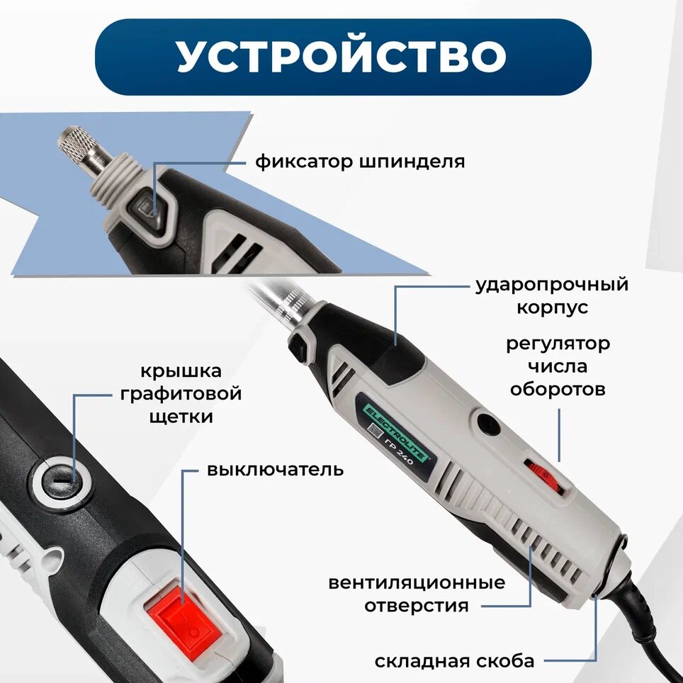 Прямошлифовальная машина / Электрогравер / Гравер электрический с гибким валом для шлифовки Electrolite ГР 240 ( 200 Вт, 30000 об./мин, 40 шт насадок, регулировка скорости, кейс)