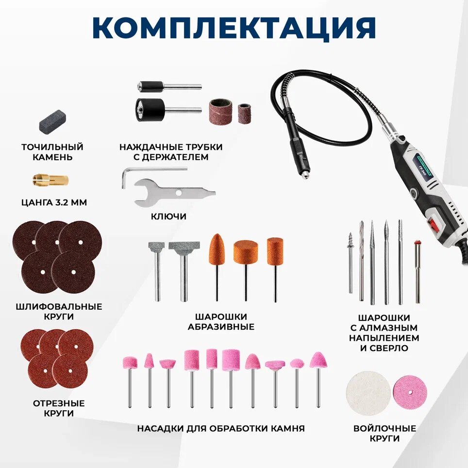 | Комплектация | гравер электрический - 1 шт., ключ рожковый - 1 шт., гибкий вал - 1 шт., штифт гибкого вала - 1 шт., паспорт - 1 шт., пластиковый кейс - 1 шт., набор аксессуаров - 1 комплект (40 шт.) |