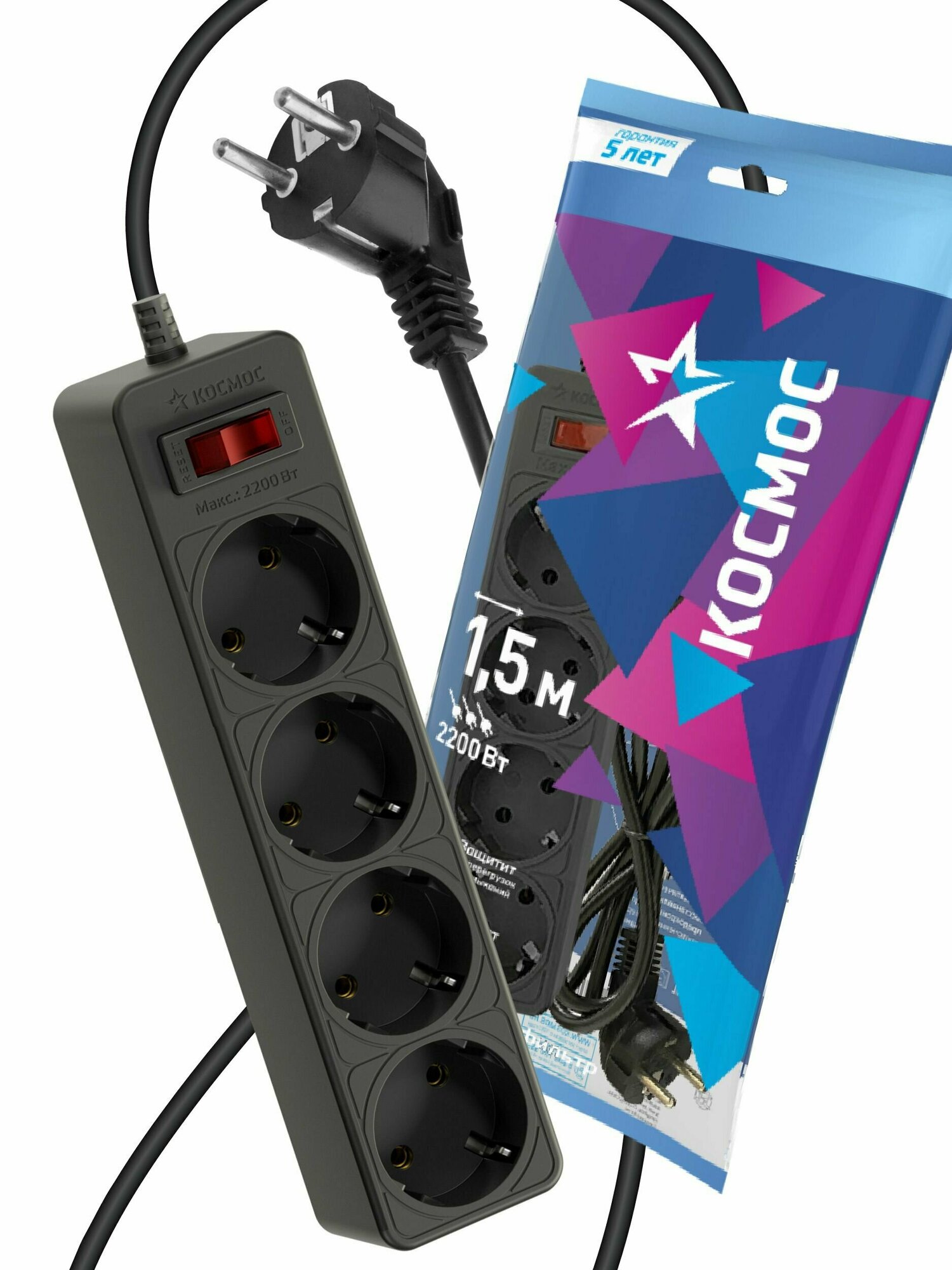 Купить Сетевой фильтр Космос 1,5м 4 гнезда, пвс 3х0,75мм2, 10А/2,2кВт черный