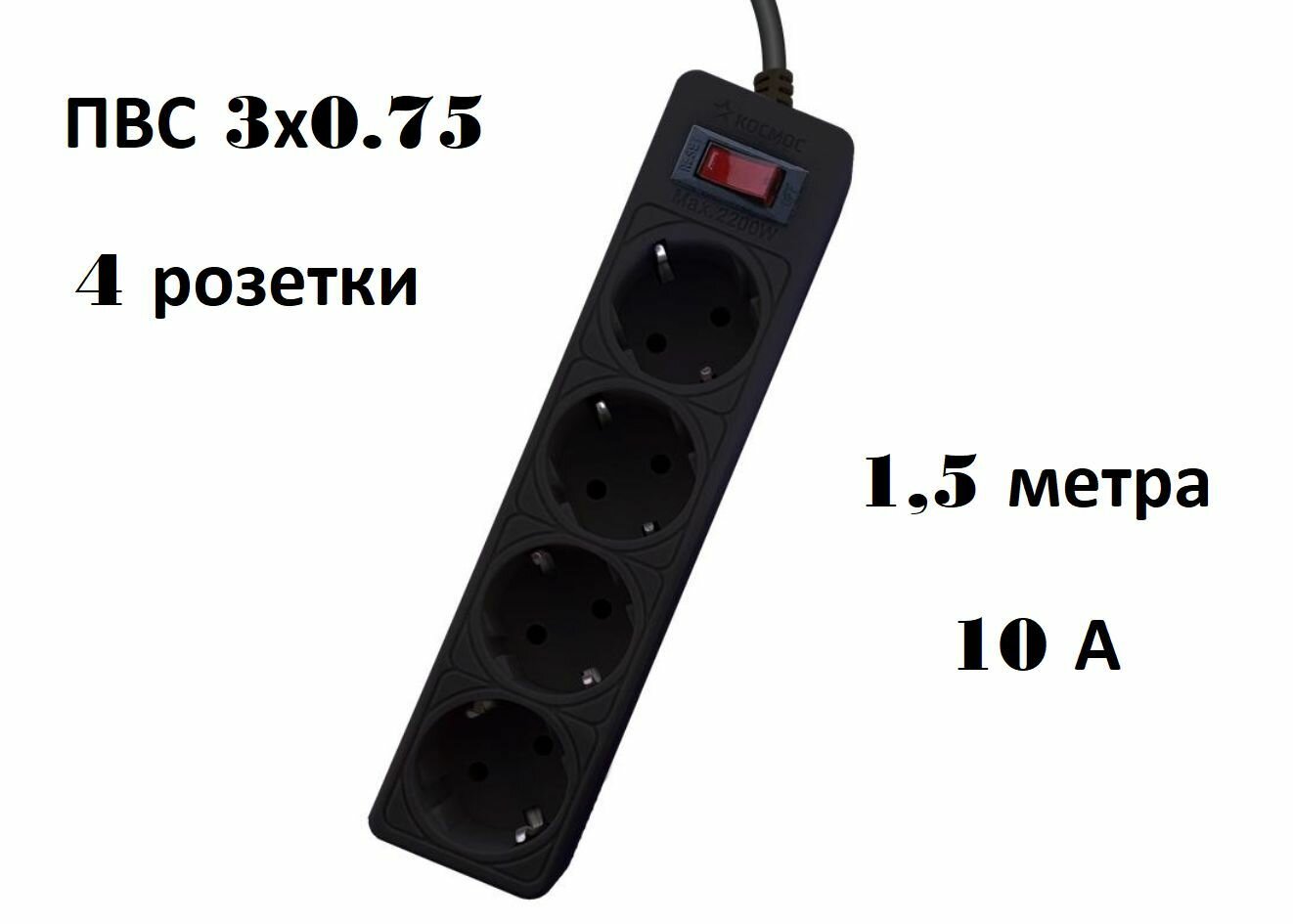 Сетевой фильтр 4гн с З/К 1,5м с выкл черный 10А ПВС 3х0.75 КОСМОС