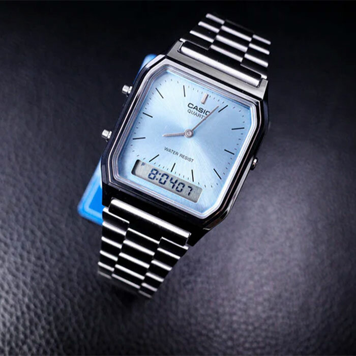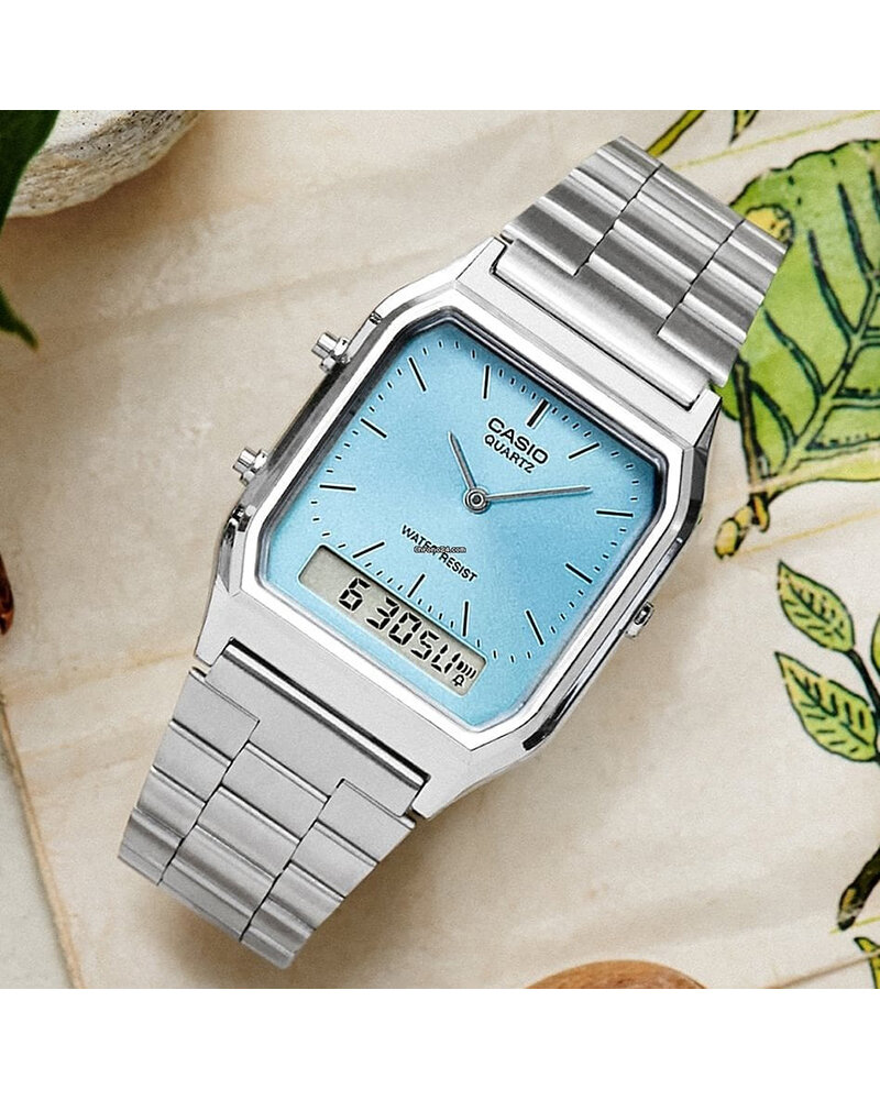 AQ-230A-2A2 Casio наручные часы кварцевые WR30 (3 атм) мужские, женские серебряный, бирюзовый секундомер будильник отображение числа, второй часовой пояс, отображение дня недели, отображение месяца акриловое стекло