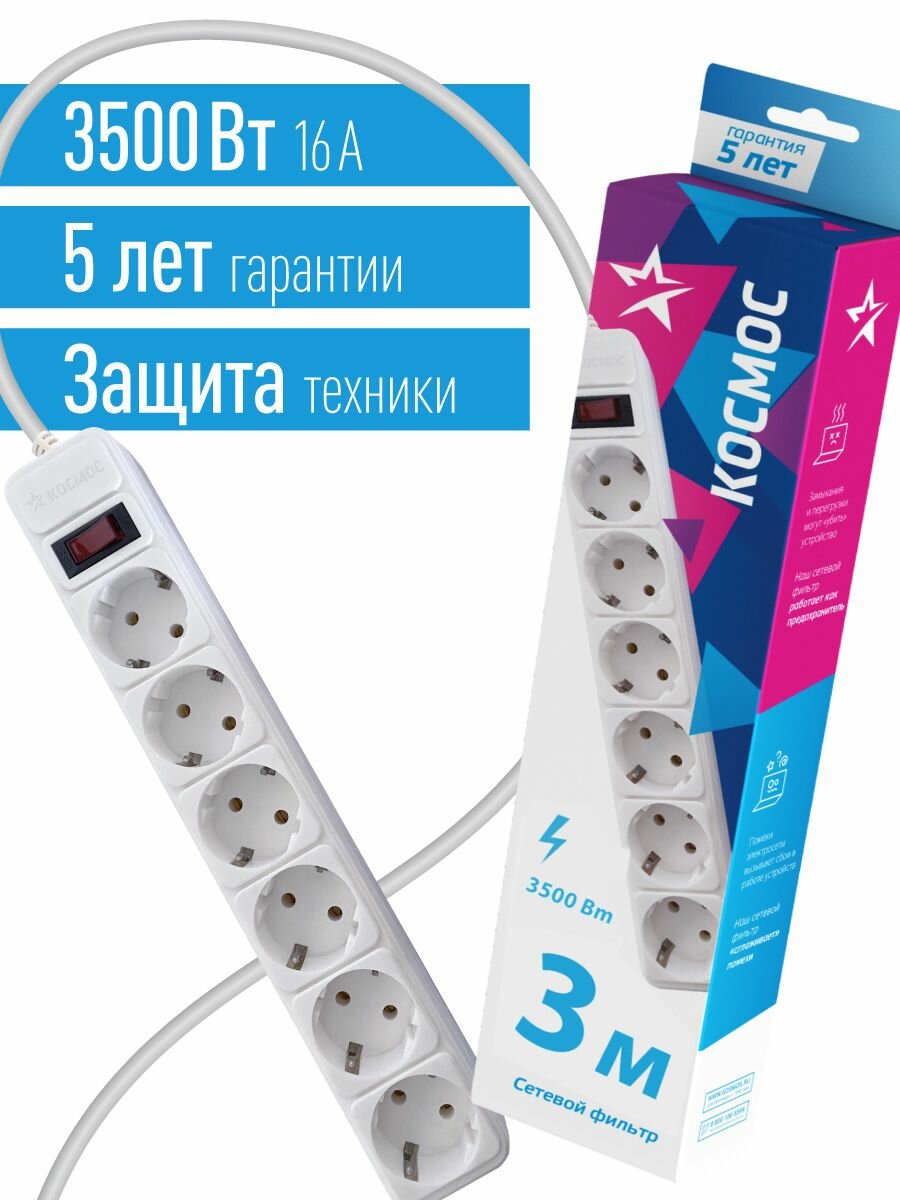 Сетевой фильтр Космос 3м 6 гнезд, белый