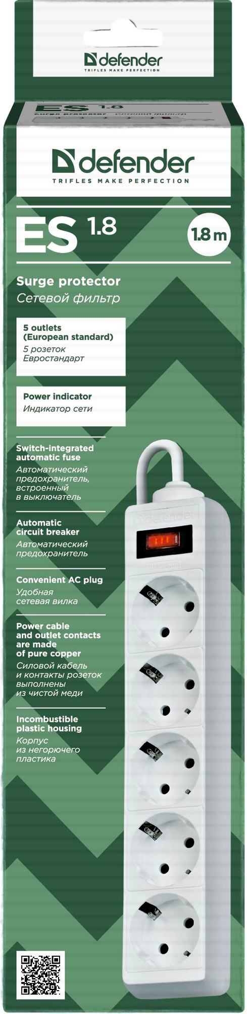 Купить Сетевой фильтр Defender ES 1.8 1,8 м, белый, 5 розеток Defender ES 1.8 (1.8 м, 5 розеток) (99481)