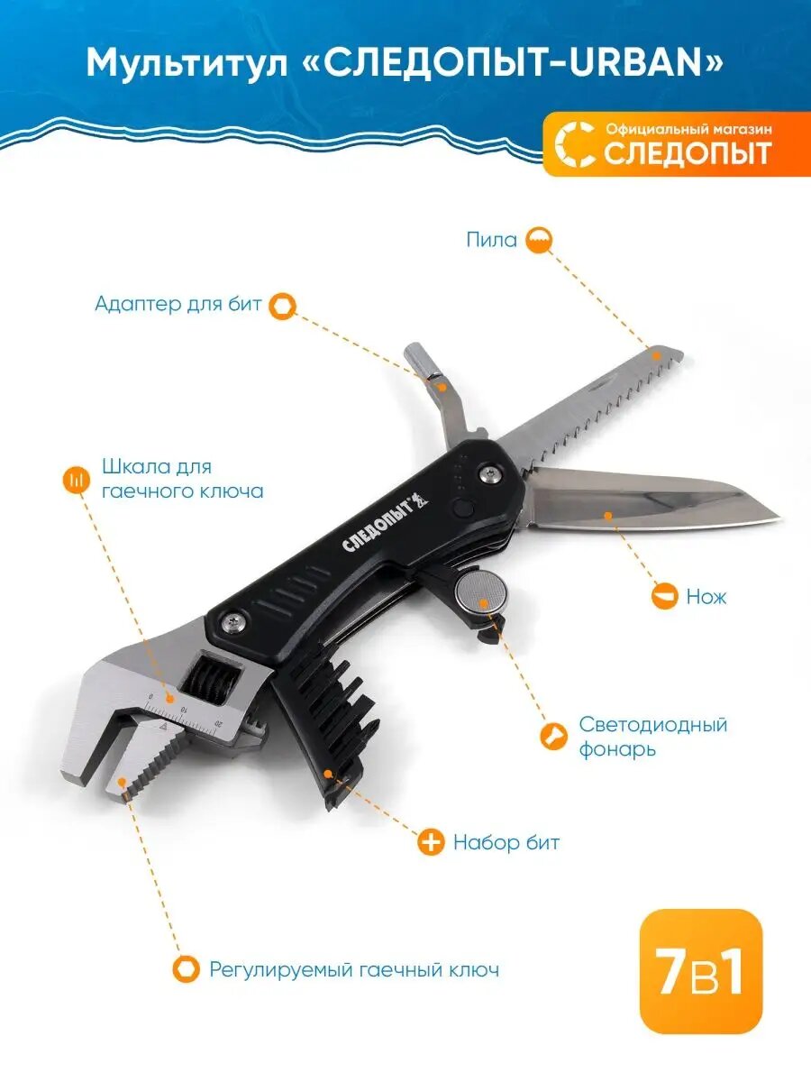Мультитул походный 7 в 1 "следопыт-urban" в чехле, с набором бит - гаечный ключ, нож, пила, фонарь, адаптер бит