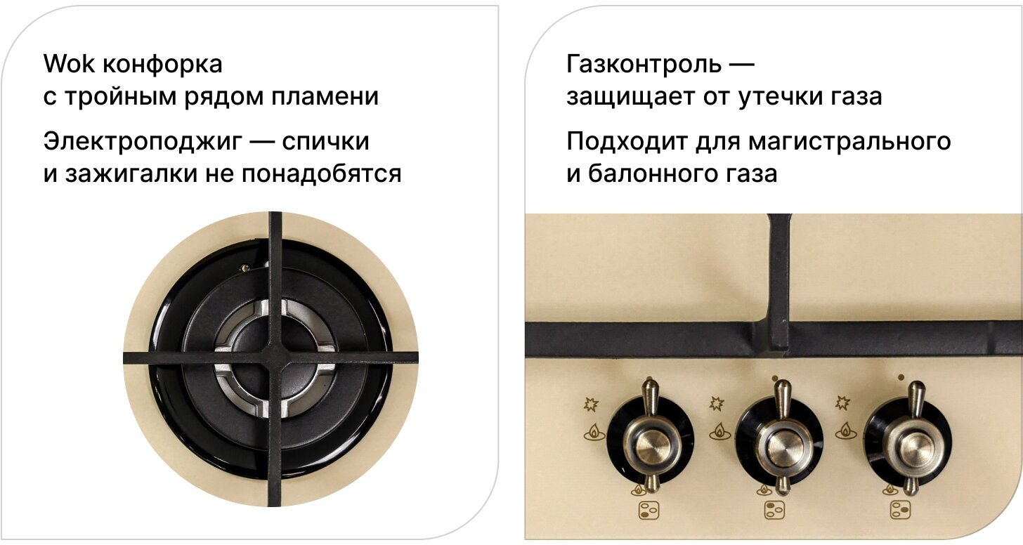 - быстро нагревается - конфорка WOK - электроподжиг - есть газ-контроль, безопасна для использования |