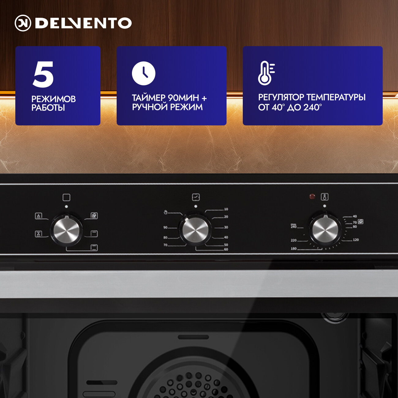 Купить Духовой шкаф электрический встраиваемый 60см черный / 5 режимов (конвекция) / DELVENTO V6EB16001 / пароочистка / подсветка / таймер 90 мин / двойное стекло LOW-E / стандартный + круглый противень / автоотключение / 3 года гарантии /