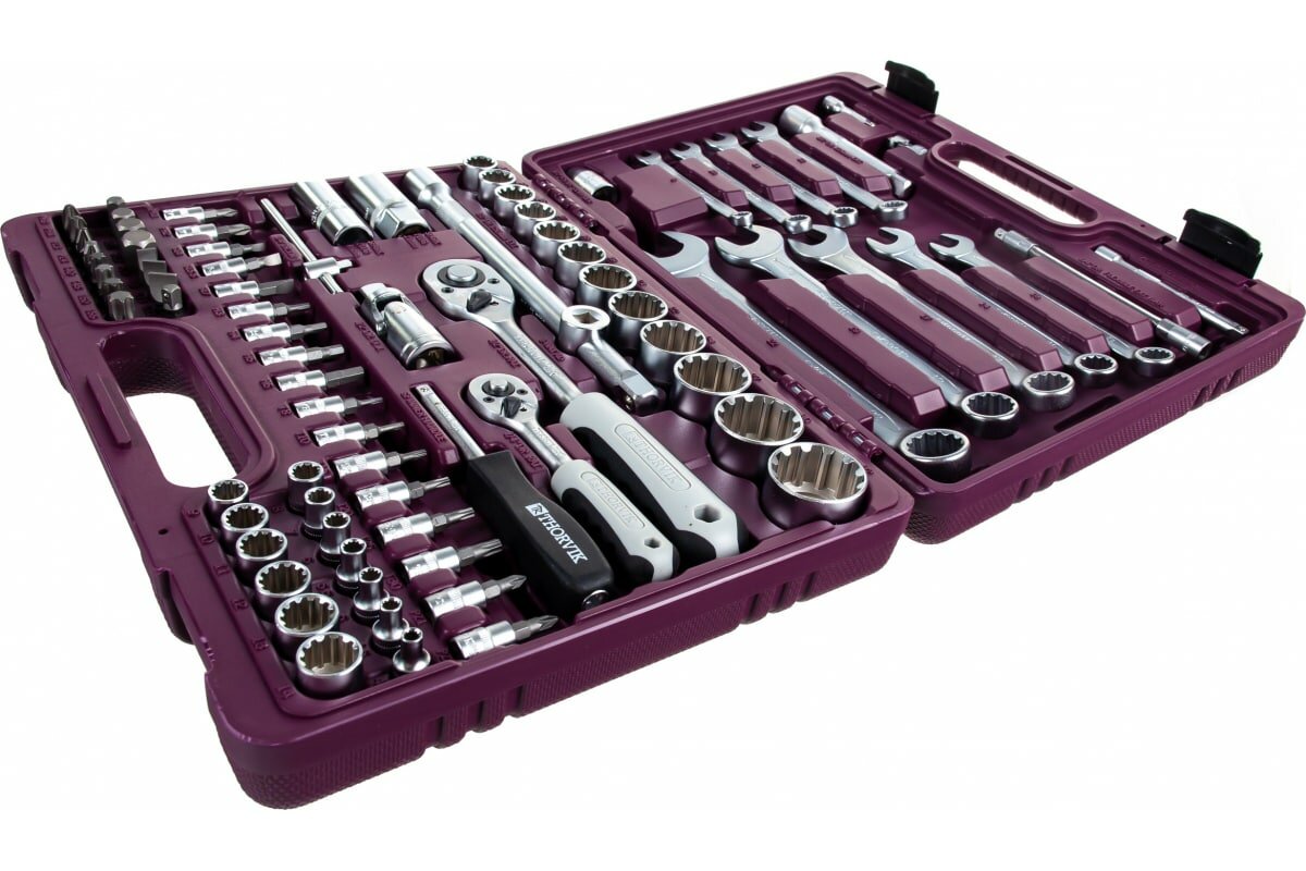 | Дополнительная информация | Набор инструмента универсальный 1/4", 1/2"DR с головками торцевыми 12-гранными, 82 предмета Thorvik |