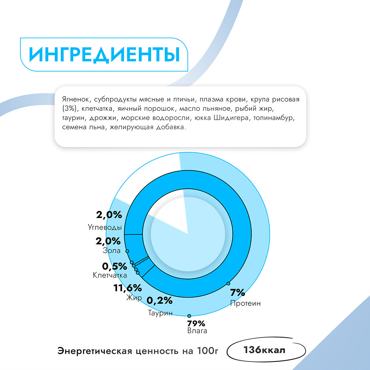 | Состав | Ягненок, субпродукты мясные и птичьи, плазма крови, крупа рисовая (3%), клетчатка, яичный порошок, масло льняное, рыбий жир, таурин, дрожжи, морские водоросли, юкка Шидигера, топинамбур, семена льна, желирующая добавка |