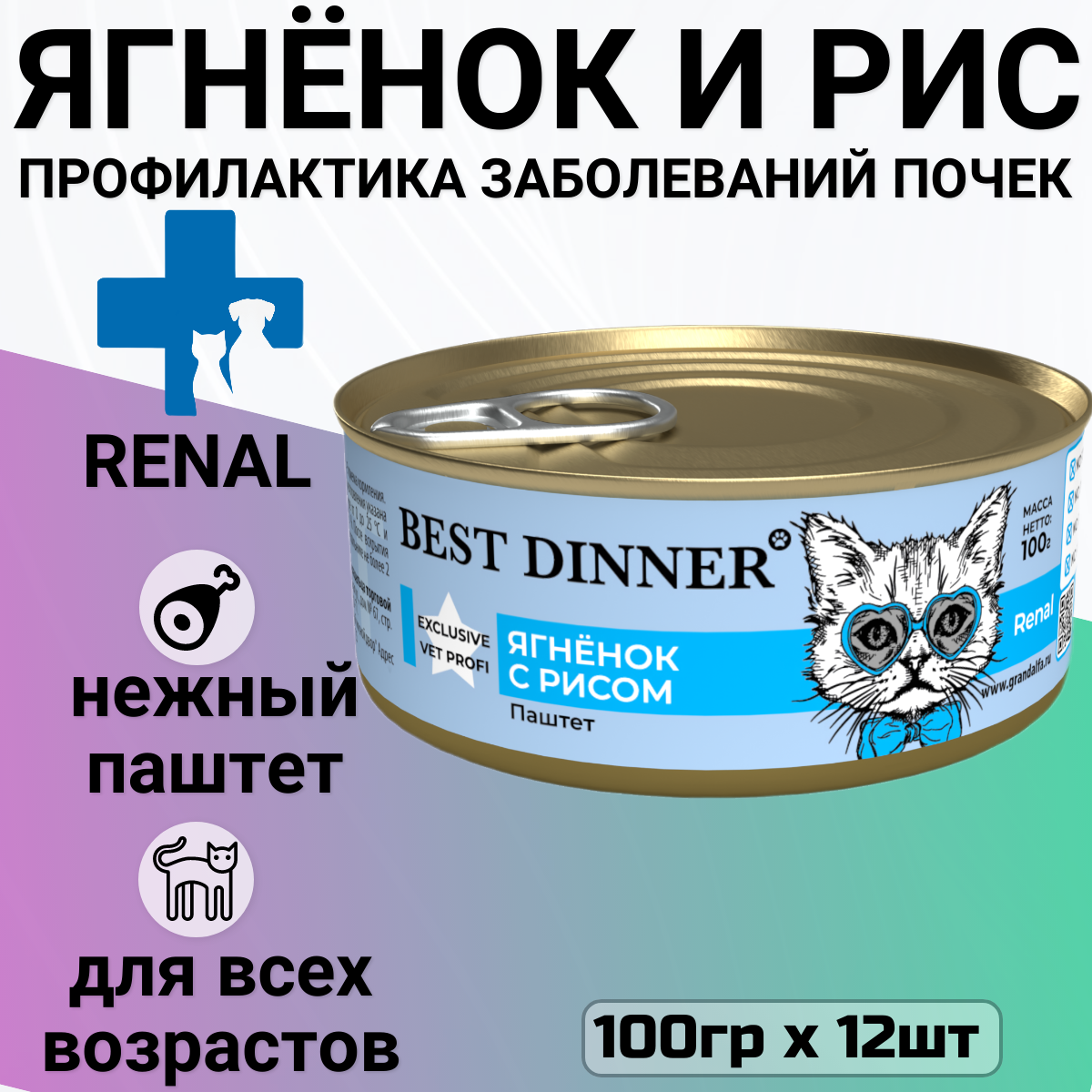 Купить Влажный консервированный корм для кошек Бест Диннер Best Dinner Renal "Ягненок с рисом" Exclusive VET PROFI 12 шт.х100 гр.