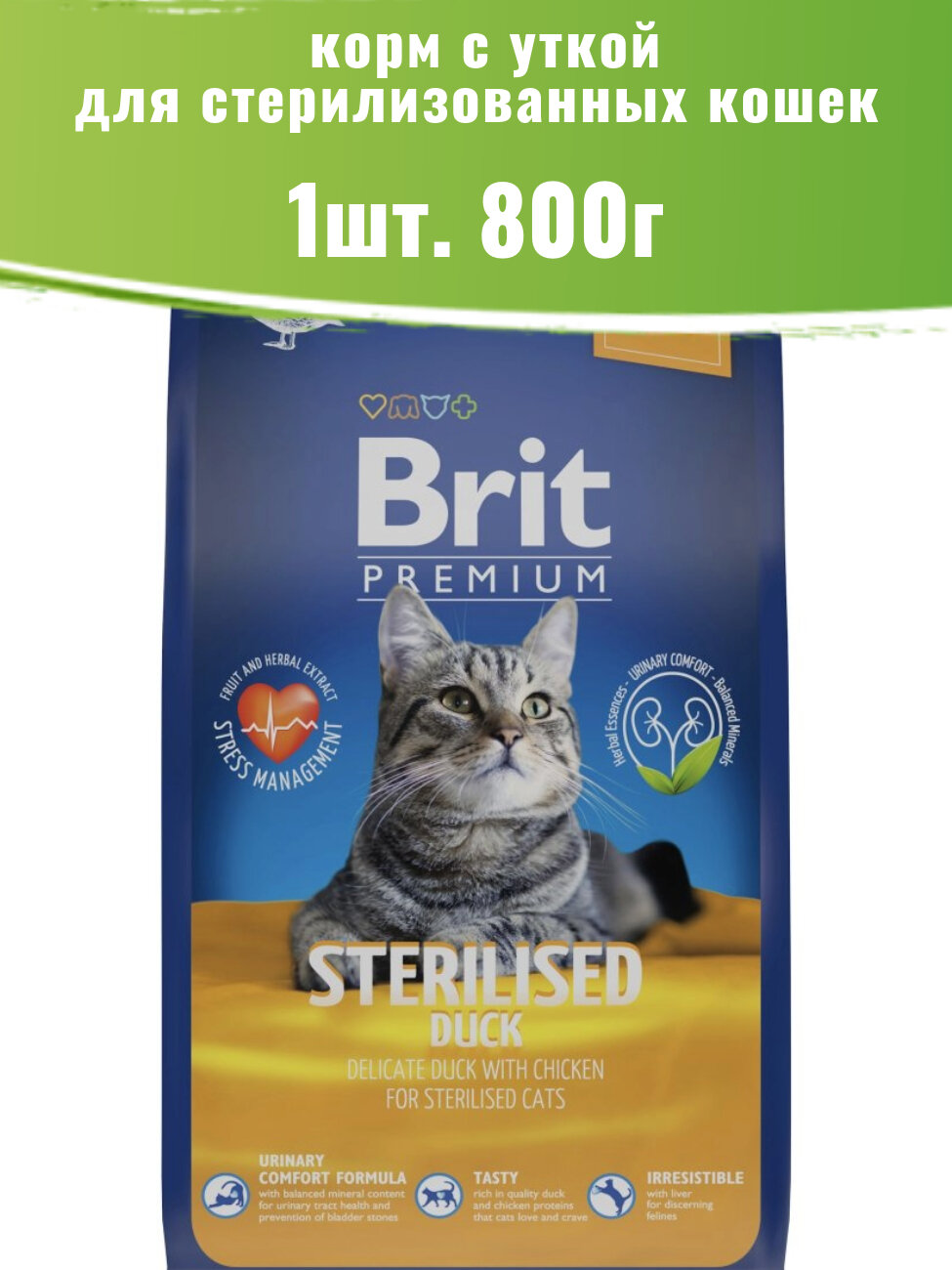 Brit Сухой корм премиум класса с уткой и курицей для взрослых стерилизованных кошек 5049813 0,8 кг 58141