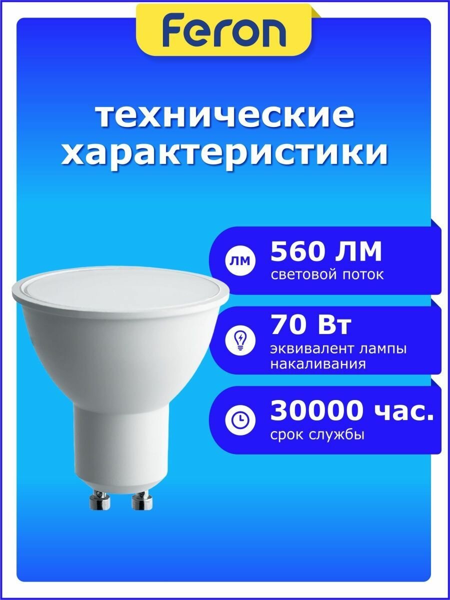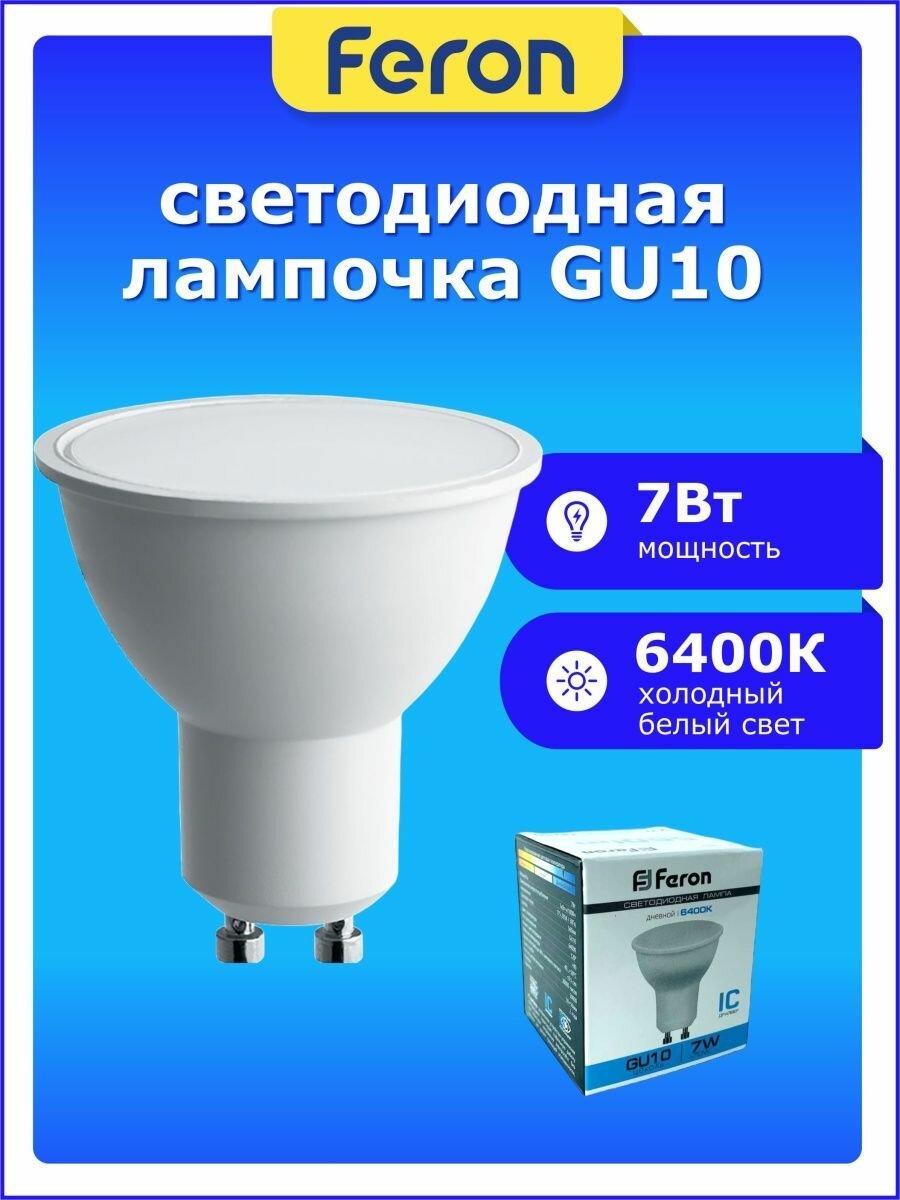 10шт/уп. Лампа LED Спот 7Вт 230B PAR16 GU10 560Лм 6400К Свет Холодный белый арт. 25291 Feron, уп. 10шт