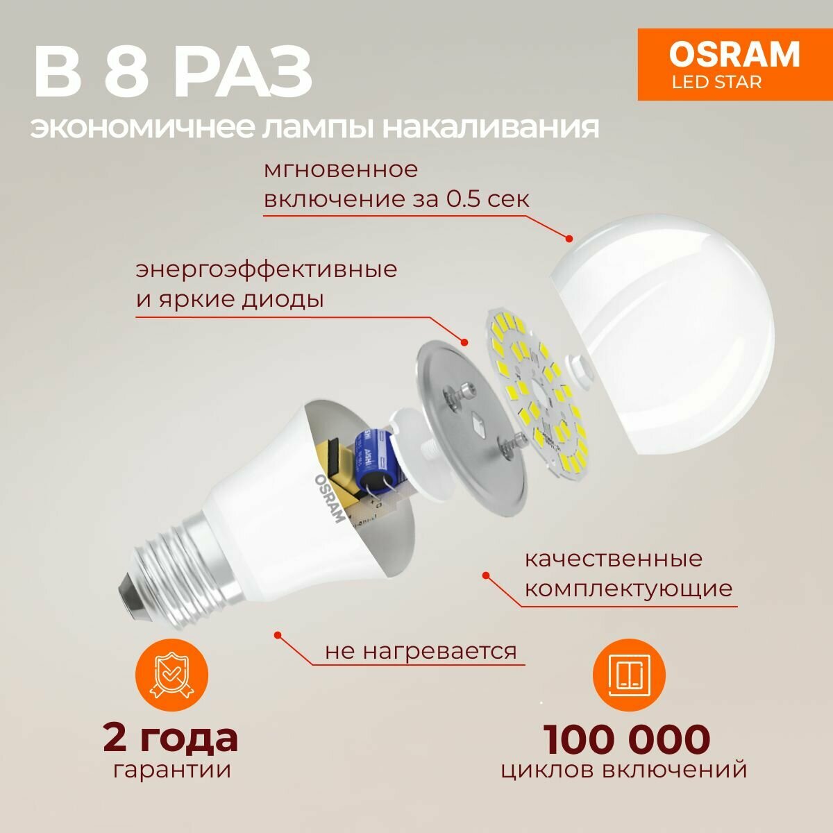 Лампочка светодиодная Е27 Osram 7 Ватт теплый свет 2700K Led Star 827 A60 груша матовая 600лм, набор 10шт