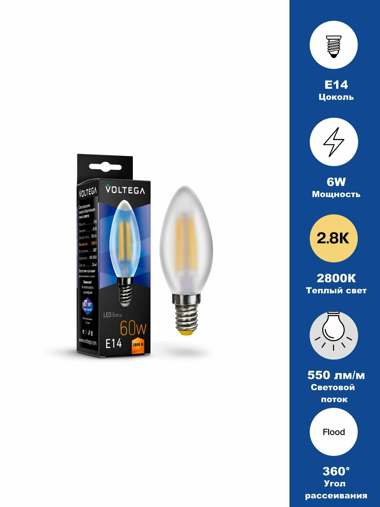 Лампочка светодиодная E14 форма матовая свеча 6W теплый свет Voltega Crystal Candle matt 2800K упаковка 6 шт.