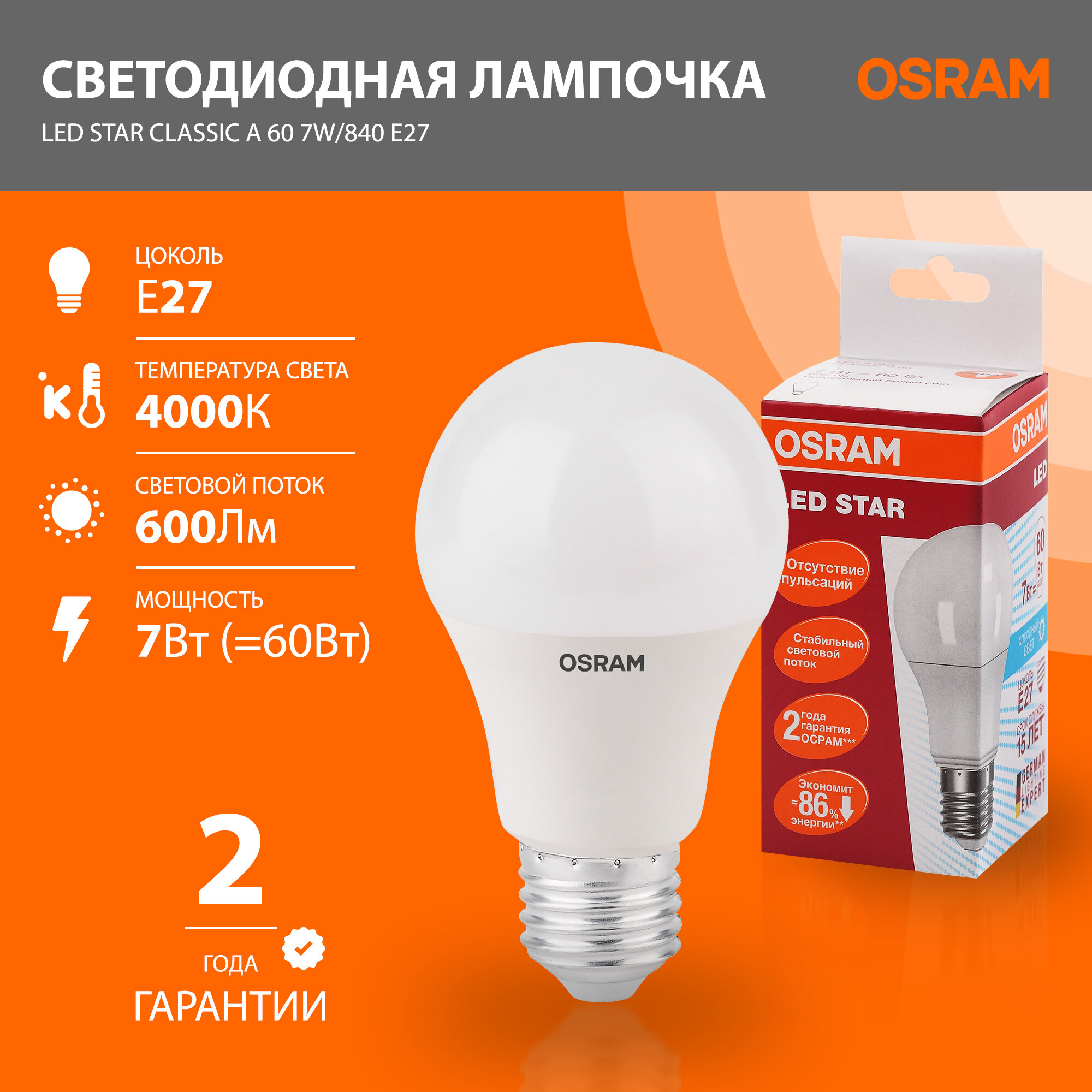 Купить Лампочка светодиодная OSRAM LED Star, 600лм, 7Вт, 4000К (нейтральный белый свет), цоколь E27