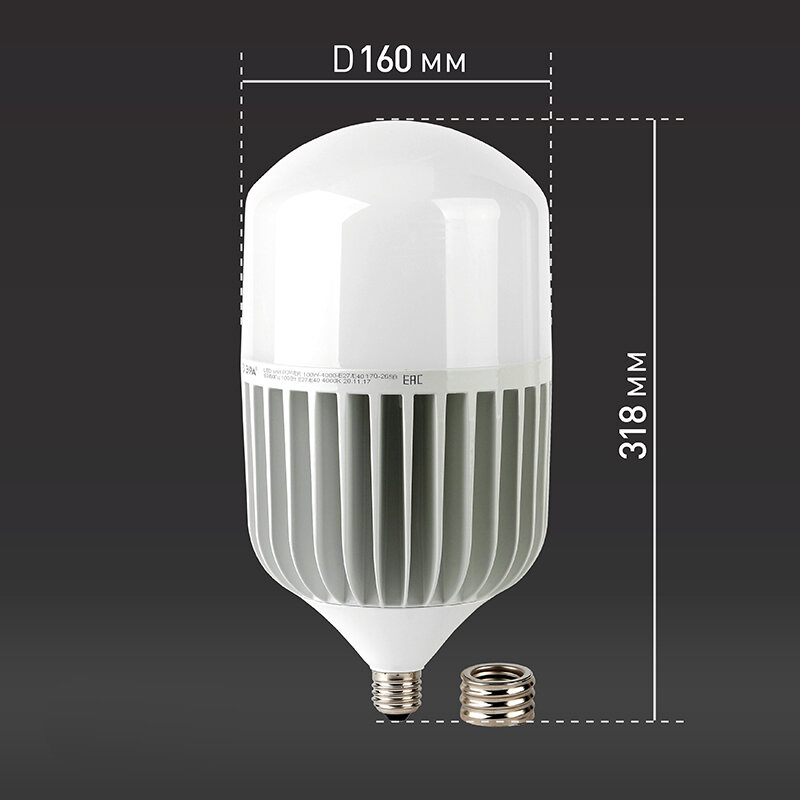 Лампа светодиодная высокомощная STD LED POWER T160-100W-6500-E27/E40 100Вт T160 колокол 6500К нейтр. бел. E27/E40 (переходник в компл.) 8000лм Эра Б0032090