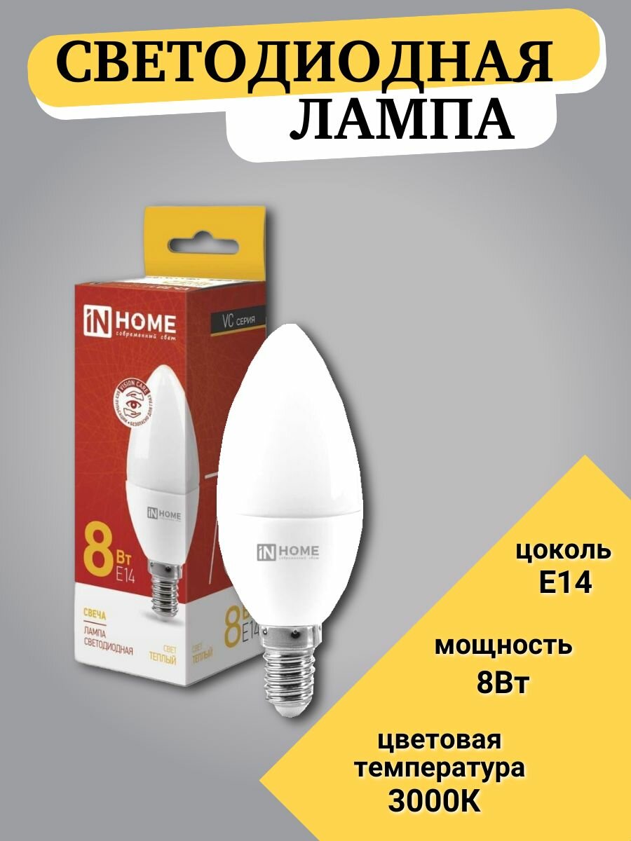 Лампа светодиодная IN HOME LED-СВЕЧА-VC (4690612020426), E14, C37, 8 Вт, 3000 К