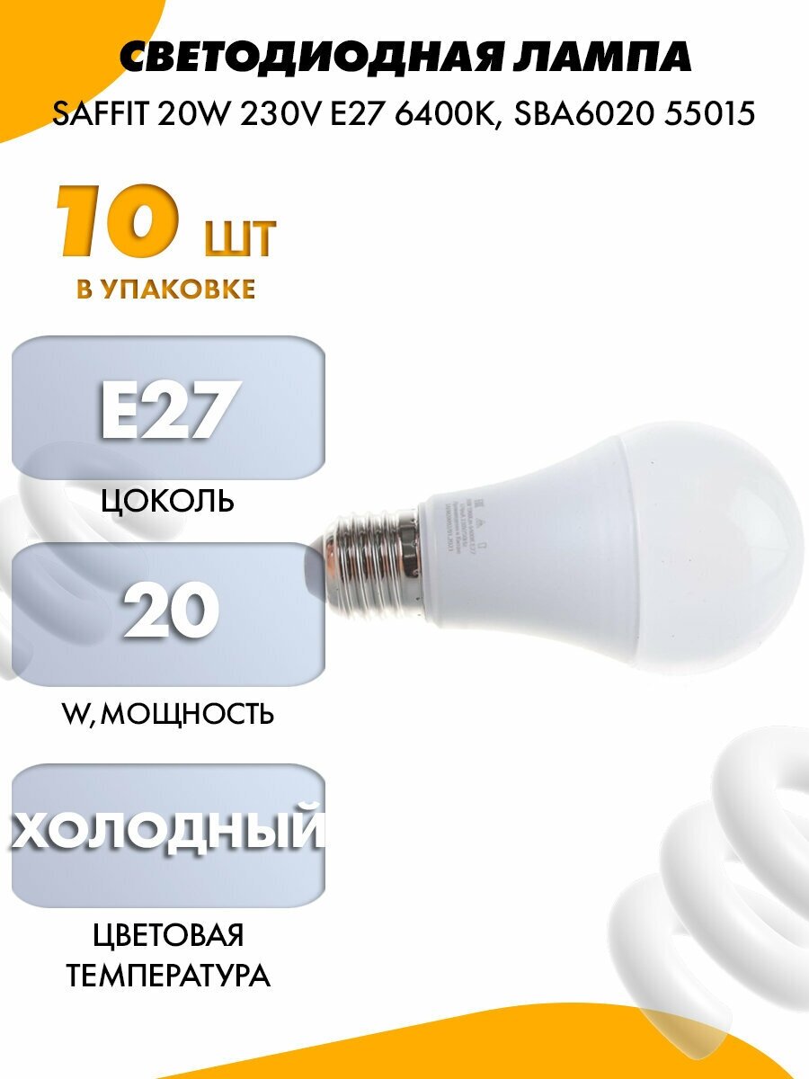55015 Лампа светодиодная SAFFIT SBA6020 Груша E27 20W 6400K, упаковка 10шт