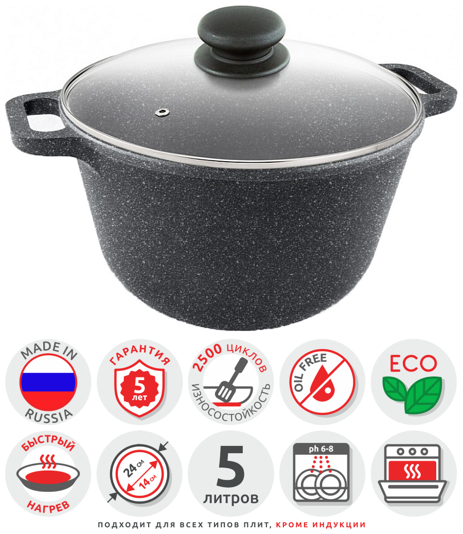 Казан НМП "Каменная" Чёрный гранит со стеклянной крышкой 5л, 186850