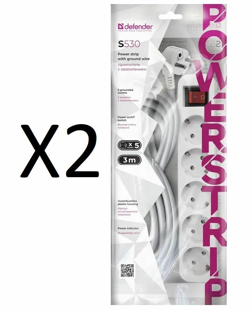 Удлинитель Defender S530, 5 розеток, с/з, 10А / 2200 Вт белый 3 м 279 мм 52 мм 40 мм 5
