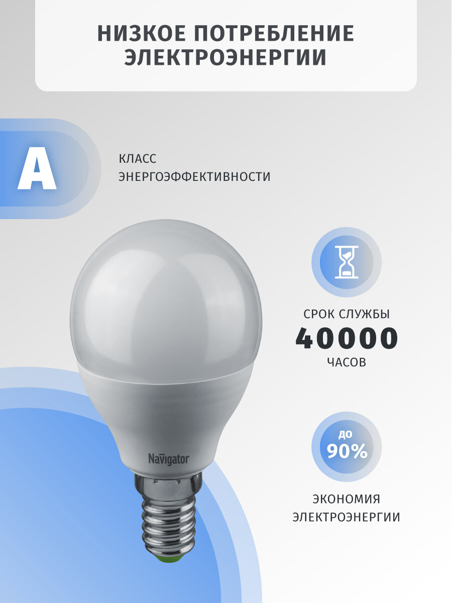 (12 шт.) Светодиодная лампочка Navigator G45, мощность 5 Вт, напряжение питания 220 В, цветовая температура 2700 K, теплый белый свет, световой поток 385 Лм, цоколь E14, размер 45х83 мм
