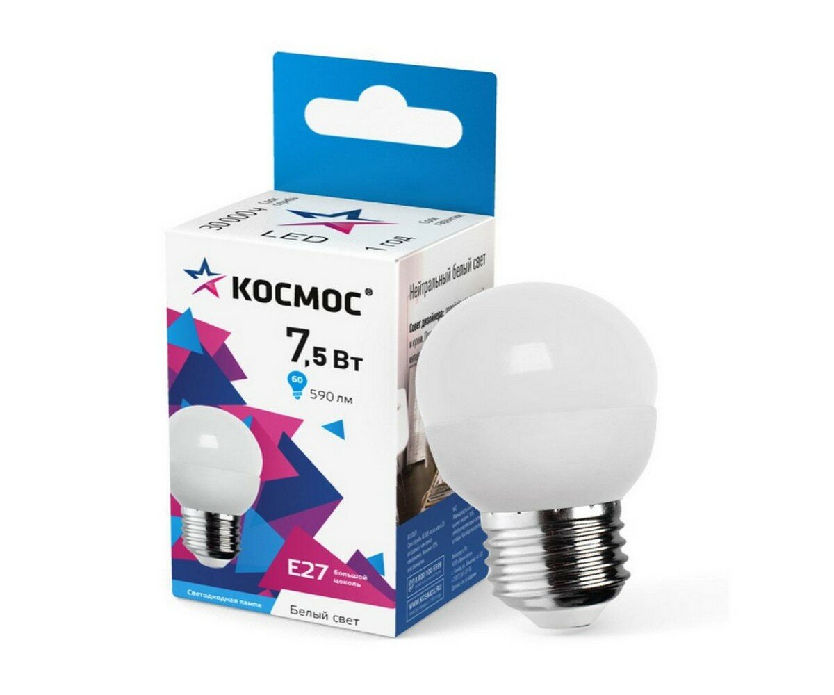 Светодиодная лампа Космос, 7.5 Вт, E27, 4500 K, шар, LED7.5wGL45E2745, нейтральный белый
