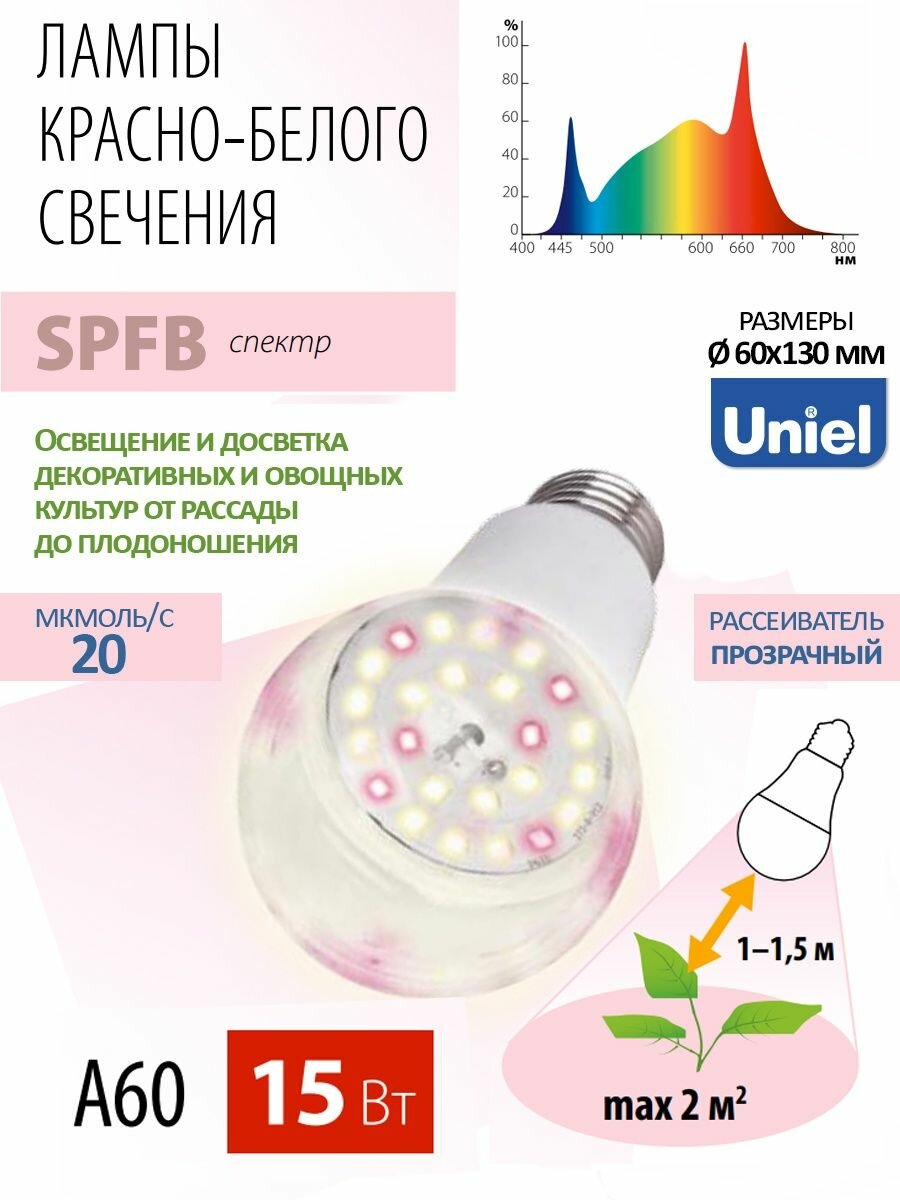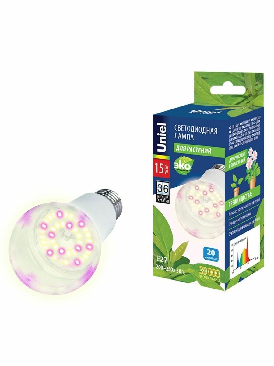 Лампа светодиодная для растений Uniel UL-00007405, E27, A60, 15 Вт