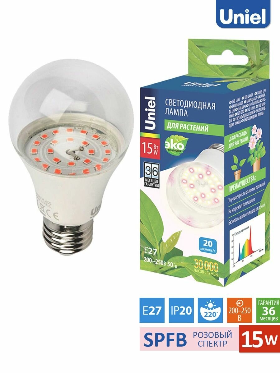 Купить Лампа Светодиодная для Растений 15W Led-a60-15w/spsb/e27/cl Plp30wh Форма А Прозрачная Пластик Uniel .