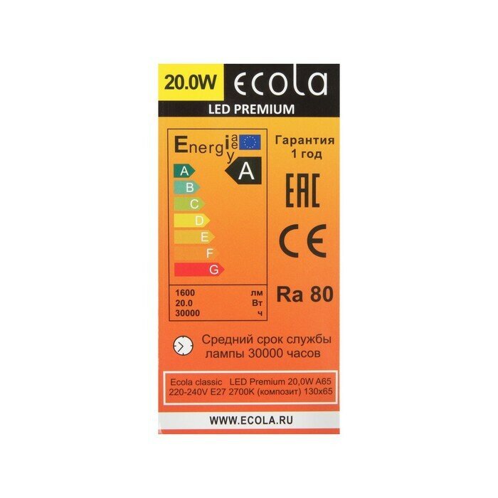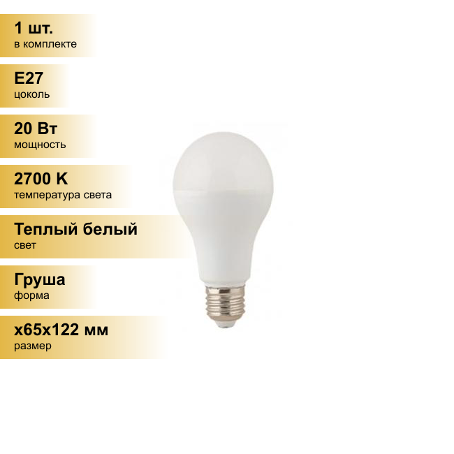 (20 шт.) Светодиодная лампочка Ecola ЛОН A65 E27 20W 2700K 2K 122x65 Premium D7RW20ELC Теплый белый. Цоколь E27