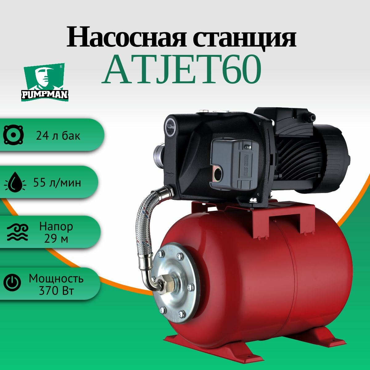Станция насосная PUMPMAN чугун, 370Вт, Hmax-29м, Qmax-55л/мин, всас 9м, г/а 24л, арт. ATJET60