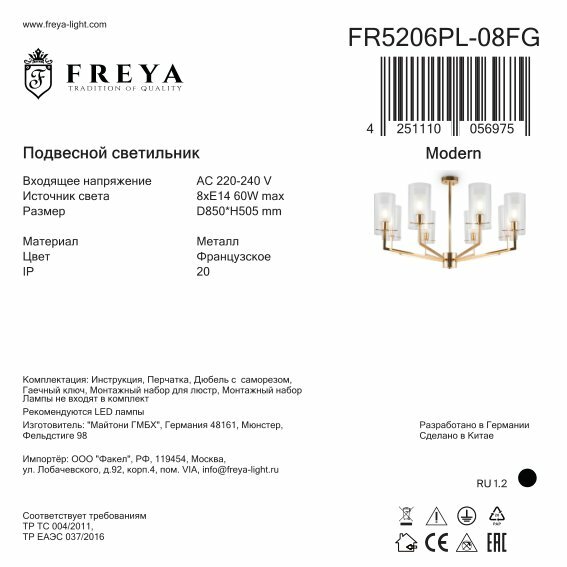 Freya Подвесная люстра Freya Modern FR5206PL-08FG