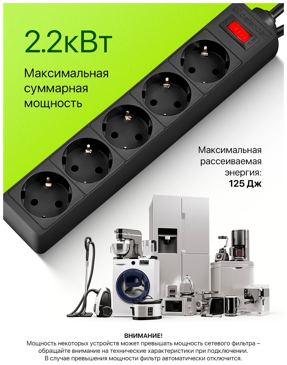 Сетевой фильтр Defender ES черный 5.0 m 5 розеток