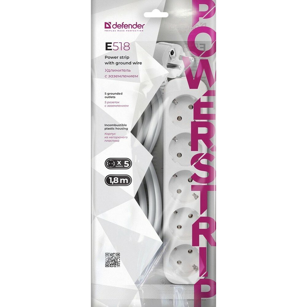 Удлинитель Defender E518, 5 розеток, с заземлением, 1,8 м, белый (99229)