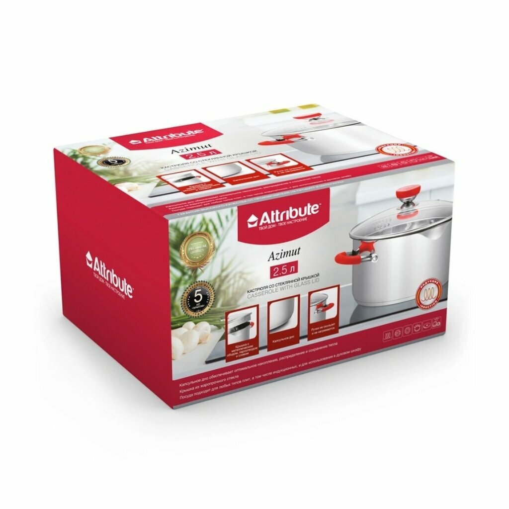 Кастрюля attribute azimut 5,8л 24см нерж.сталь стекл.крышка индукция