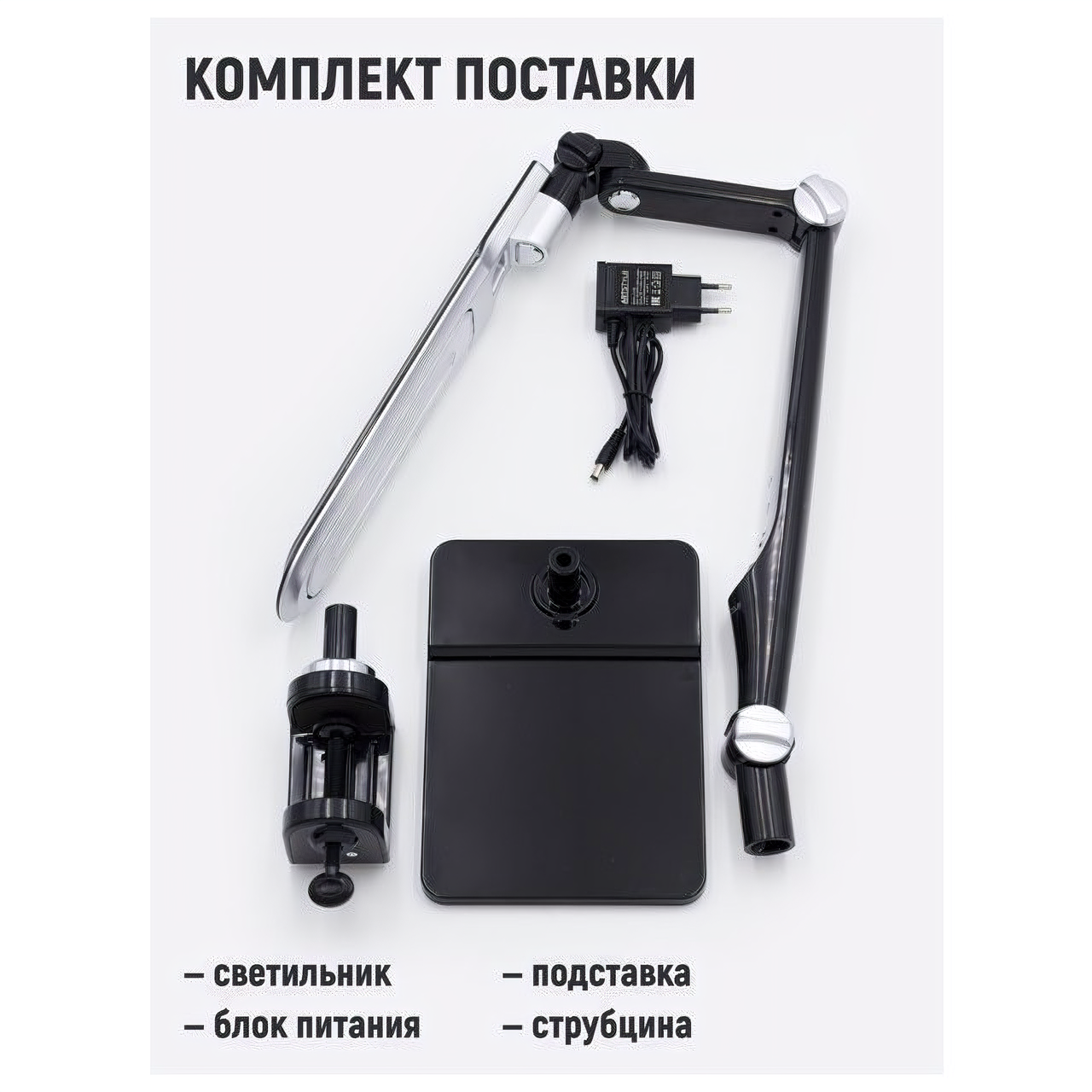 | Дополнительная информация | 2 варианта установки: на подставке и на струбцине; 3 режима свечения: теплый 3000K, нейтральный 4200K, холодный 6300K; регулировка в 6 плоскостях; световой поток светодиодов эквивалентен лампе накаливания мощностью 100 Вт |