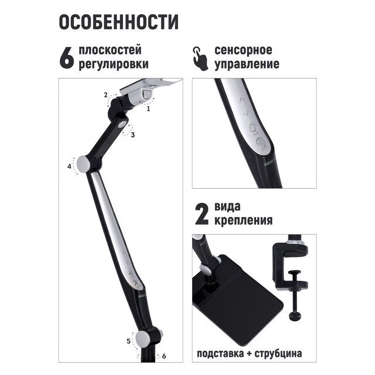 Светильник настольный Artstyle LED, 3 уровня яркости, на подставке, струбцина, сенсор, черный