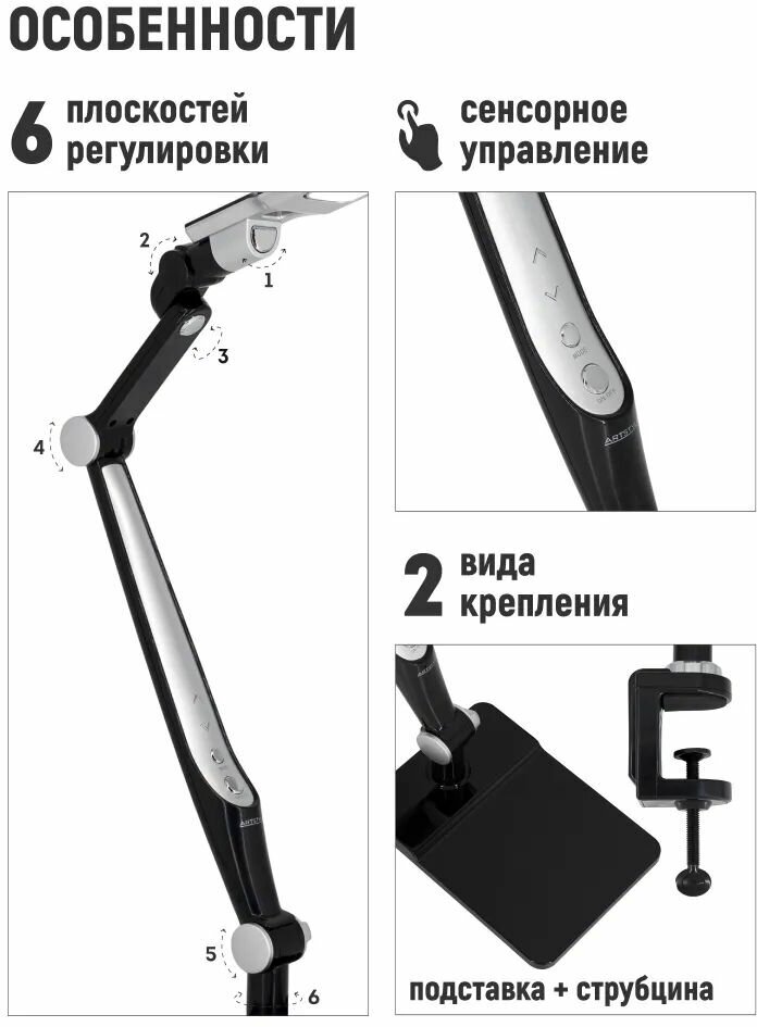| Дополнительная информация | 2 варианта установки: на подставке и на струбцине; 3 режима света; регулировка в 6 плоскостях; световой поток светодиодов эквивалентен лампе накаливания мощностью 100 Вт |