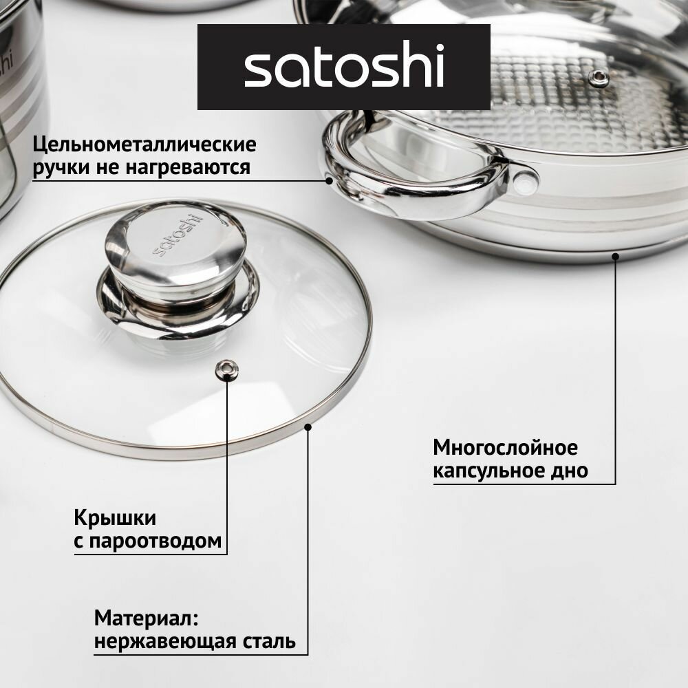 Набор посуды для приготовления SATOSHI Рокруа, 12 предметов, нержавеющая сталь, с крышками, 4 кастрюли 1,9-6,2 л; ковш 1,9л; сковорода 3,1 литра, набор кастрюль для готовки