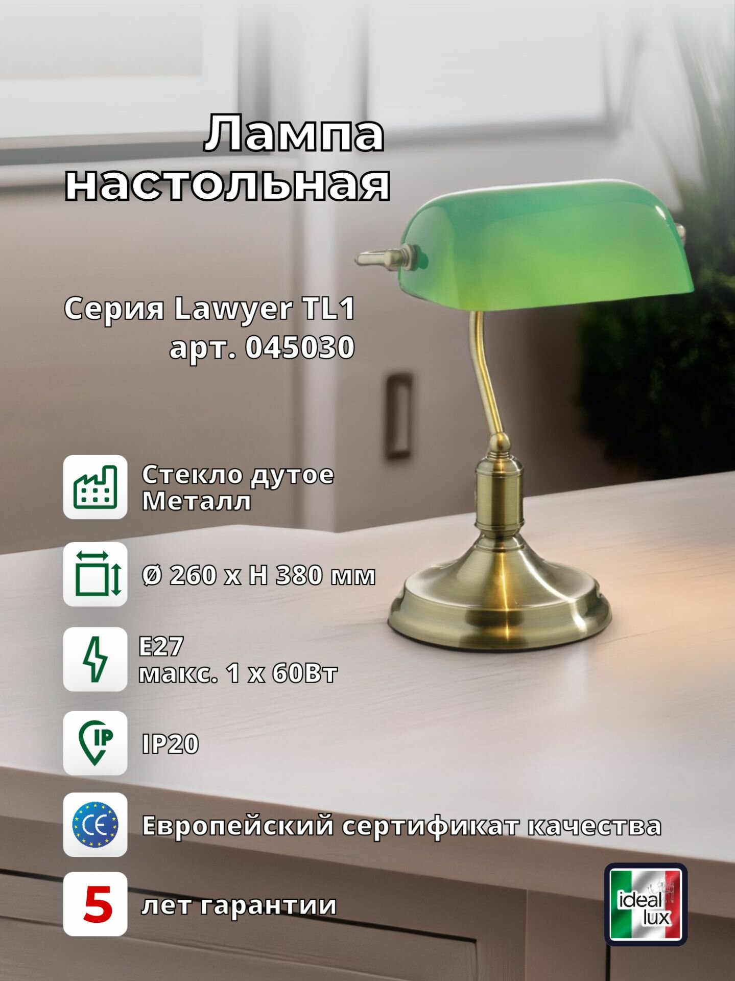 Светильник настольный ideal lux Lawyer TL1 макс.1х60Вт IP20 Е27 230В Латунь/Зеленый Металл/Стекло Выключатель Без лампы 013657.